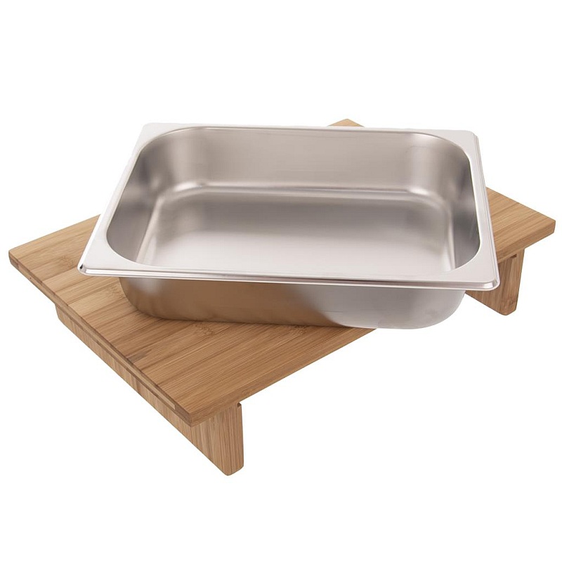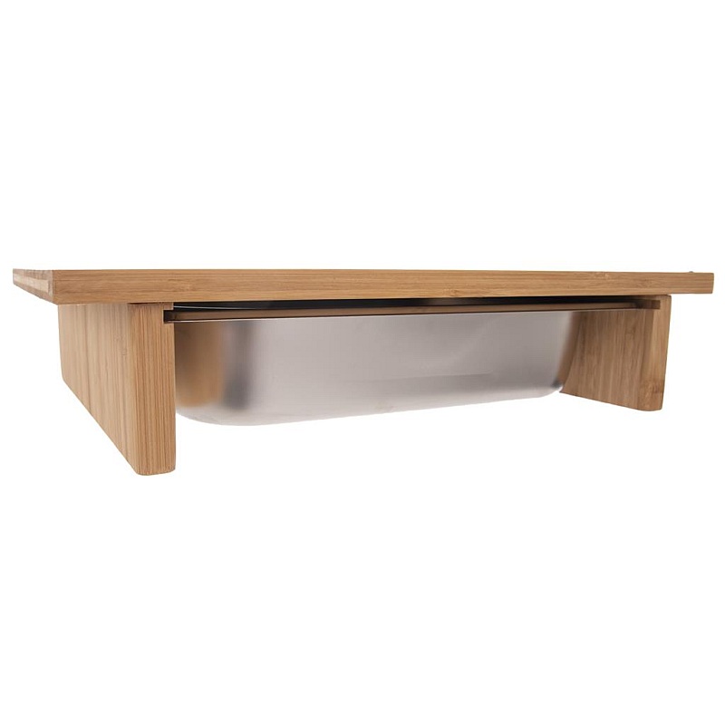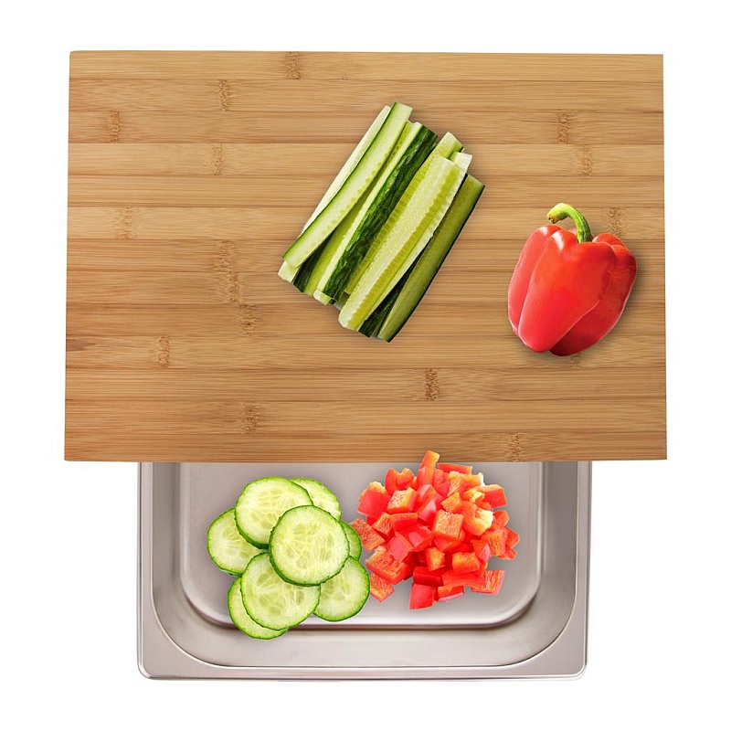Doska na krájanie so zásobníkom . Doska bambus 42 x 29 cm + zásobník nerez . Doska na krájanie so zásobníkom je veľmi praktický pomocník, ktorý bude vždy po ruke. Na doske pohodlne nakrájate ingrediencie, vytiahnete zásobník a veľmi ľahko doňho všetko nakrájané zhrniete. Materiál: bambusové drevo, nerez. Nerezový zásobník sa dá umyť v umývačke na riad. Rozmery: doska 42 x 29 x 8,5 cm, zásobník 32,5 x 26,5 x 6 cm.