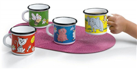Hrnček s detským motívom červený . Hrnček smaltovaný s detským motívom, priemer 8 cm, výška 8 cm, objem 0,4 l