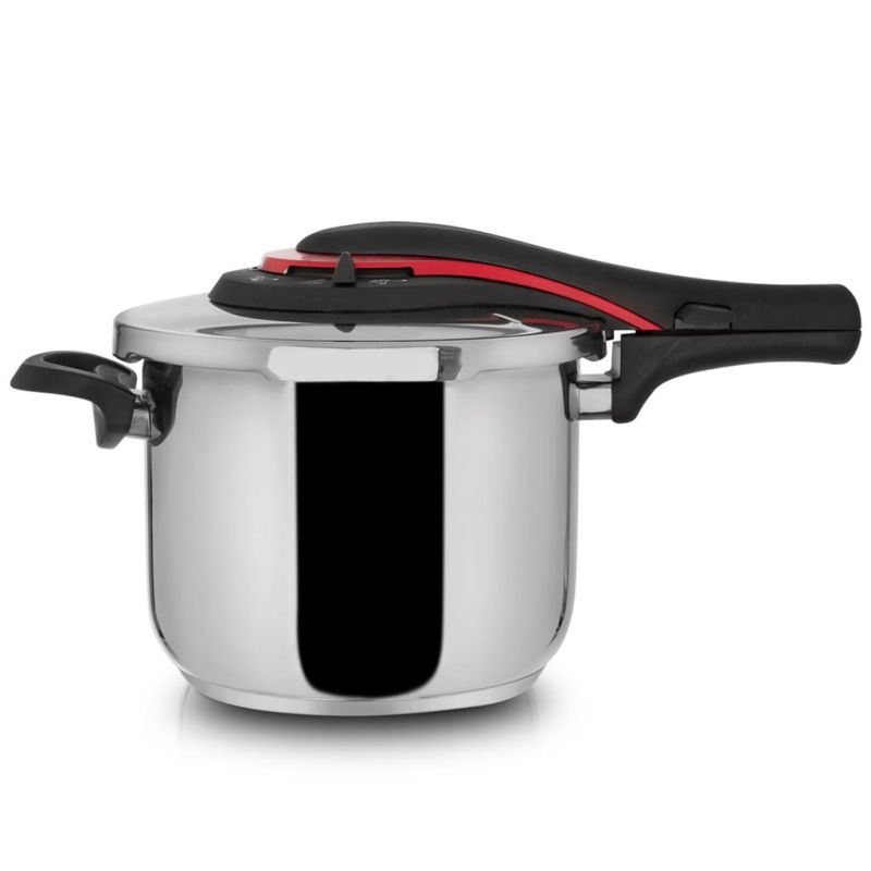 Hrniec tlakový nerez UPLINE 6 l . Tlakový hrniec UPLINE z kvalitnej nerezovej ocele so sendvičovým dnom s termoakumulačnými vlastnosťčami. Hrniec je vhodný na všetky typy teplených zdrojov vrátane indukcie a je vhodný do umývačky riadu ( bez veka ). Zaručuje ekonomické varenie – krátka doba prípravy pokrmov a značná úspora energie. Tepelný zdroj vypíname s predstihom – naakumulovaná energia predáva teplo ďalej do nádoby. Veľmi jednoduchý systém otvárania a zatvárania. Hrniec je opatrený pracovným ventilom s možnosťou nastavenia intenzity vypúšania pary – 3 stupne. Je nutne plniť hrniec vždy iba do označenej výšky hladiny MAX. Materiál: kvalitná nerezová oceľ 18/10, plast, bakelit. Rozmery: objem 6 l, priemer 22 cm, výška 18/23 cm.