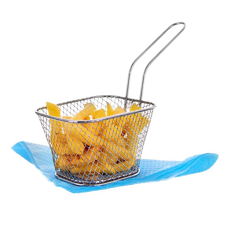 Košík drôt servírovací na hranolky 10 x 8 cm . Košík s rukoväťou na efektívne servírovanie príloh – hranolky, krokety, grilovaná zelenina, šalát… Materiál: drôt. Ide v nich fritovať. Nie je možné umývať v umývačke na riad. Po umytí dôkladne osušte. Rozmery: 10 x 8 cm, dĺžka 19 cm.