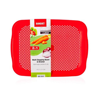 Veľmi praktické plastové doska na krájanie a sito 2 v 1 BANQUET o rozmere 36,5x27x3 cm . Možno na ňom potraviny umyť, olúpať , zároveň aj krájať . Možno umývať v umývačke . K dostaniu vo farbe zelenej , červenej a oranžovej .