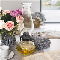Petrolejová lampa . Petrolejová lampa so skleneným telom, klasickým cylindrom a bavlneným knôtom slúži po naplnení petrolejom alebo lampovým olejom ako doplnkové svetlo v interiéri. Krásna petrolejová lampa urobí z obyčajného podvečera pohodovú záležitosť, doplnenú plápolajúcim plamienkom, ktorého svetlo umocní sklenený cylinder a prežiari teplým svetlom okolia. Napríklad tú časť izby, kde si chcete čítať obľúbenú knihu alebo piť pohár vína.