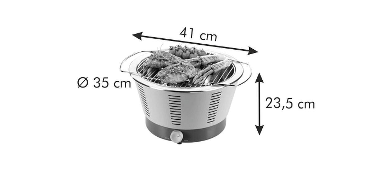 Power gril PARTY TIME Tescoma . Vysoko výkonný prenosný gril Tescoma s turbo ventilátorom, vďaka ktorému je možné grilovať už 5 minút po zapálení dreveného uhlia a teplotu grilu ľahko regulovať. Tuk z pokrmov nesteká na rozžeravené uhlie, gril nedymí, telo grilu nepáli. Veľký grilovací rošt z nehrdzavejúcej ocele je opatrený úchytkami pre pohodlné prenášanie, drevené uhlie možno počas grilovania ľahko dopĺňať. Gril je skladný, ľahko sa udržuje čistý, všetky nerezové časti sú vhodné do umývačky. Poháňaný 4 tužkovými AA batériami 1.5 V. Určený pre vonkajšie použitie. 3 roky záruka.