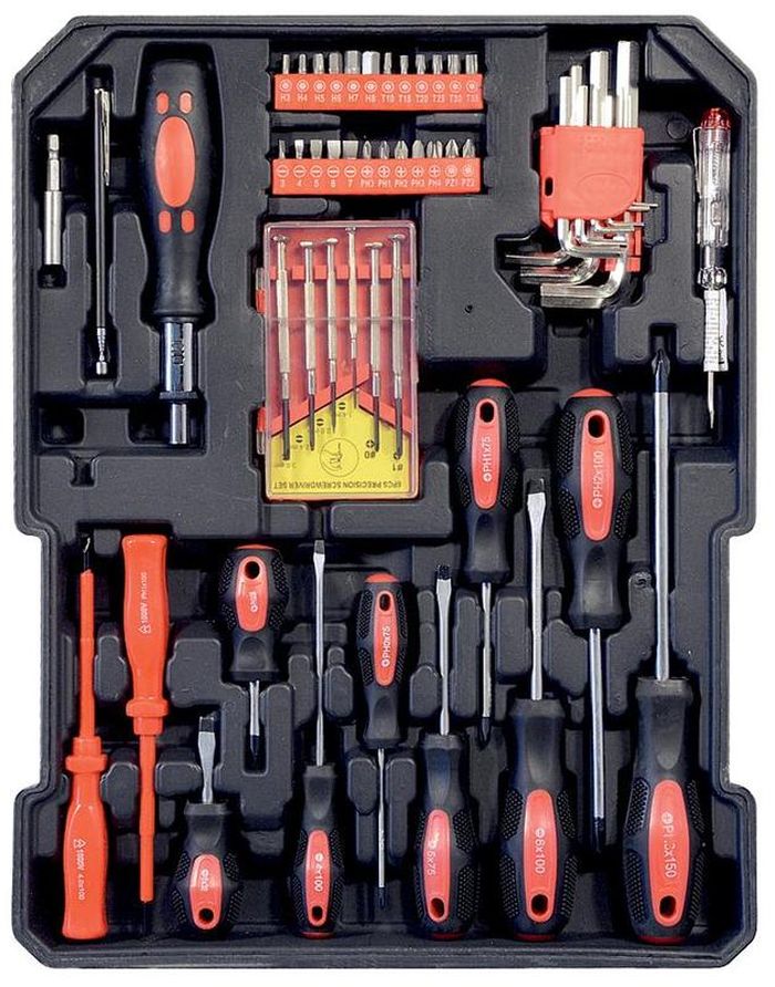 - 11 ks Skrutkovač (-)4 x 100, 5 x 75, 6 x 38, 6 x 100 mm / (+)3 x 75, 5 x 75, 6 x 38, 6 x 100, 8 x 150 mm / Izolované (+)4 x 100 mm, (-)4 x 100 mm