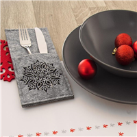 Vrecko na príbory polyester MANDALA 2 ks . Sada 2 kusov filcových vreciek v šedej farbe, určené na jednoduché založenie príborov, ozdobí prestretý stôl cez víkend, narodeniny i sviatky. Jednoduchý tvar a vyseknutý dekor mandaly. Zaujímavý doplnok pre slávnostné stolovanie, ktorý oživí ktorúkoľvek prestretú tabuľu. Sada 2 kusov obdĺžnikových vreciek uľahčí založenie príborov vedľa tanierov. Nebude nutné zložito skladať obrúsky, príbory stačí jednoducho vložiť do vrecka a položiť vedľa tanierov.