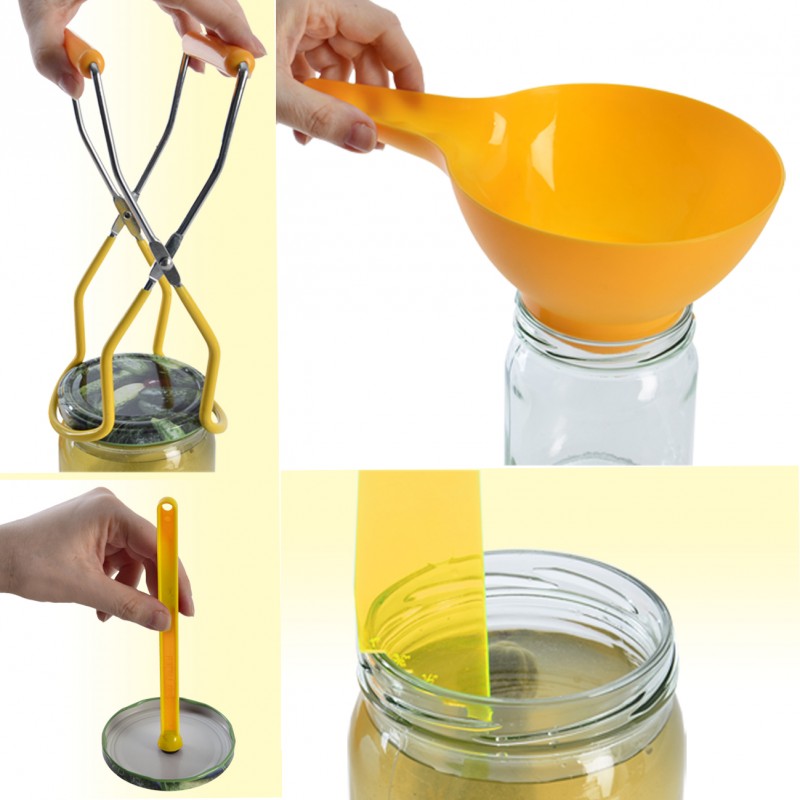 Súprava na zaváranie obsahuje rôzne potrebné náčinie pre pohodlné zaváranie ovocia, zeleniny, mäsa - kliešte na vyberanie zaváracích pohárov z horúcej vody, lievik na ľahké plnenie pohárov, špachtľa na stláčanie alebo narovnanie zaváraných plodov a magnetický vyťahovač kovových viečok (z horúcej vody, v ktoré je potrebné viečka sterilizovať). Materiál: plast, kov, magnet. Rozměry: lievik - pr. horný 14 cm, pr. spodný 5,5 cm, d. 22 cm, kliešte 8x4x22,5 cm, magnet. vyťahovač d. 17,5 cm, špachtle d. 22 cm.